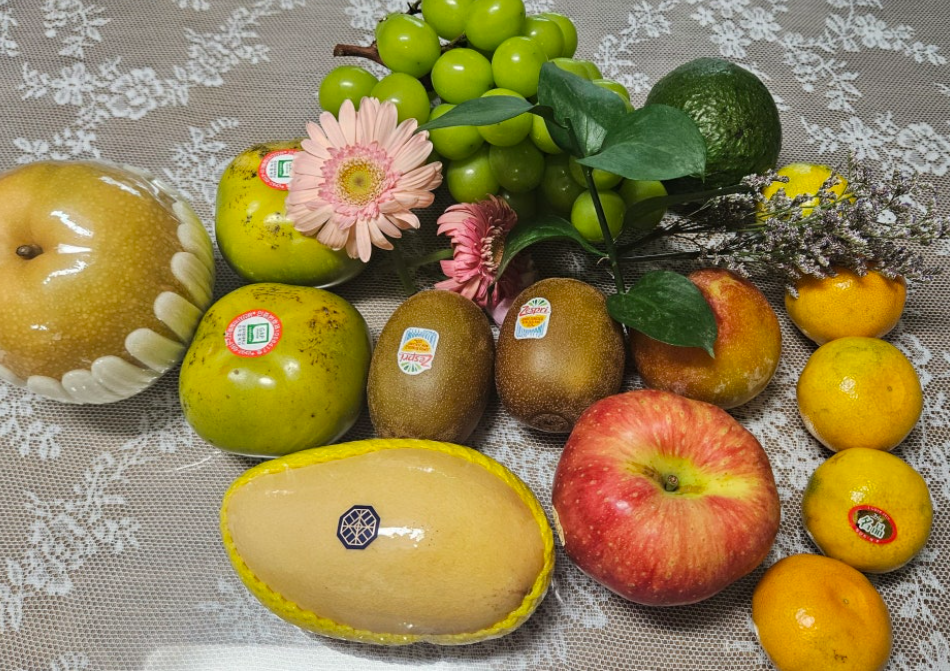 • 배,단감2,골드키위2,대왕자두1,아보카도1 귤5,망고1,사과1샤인머스킷1