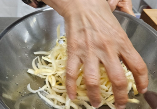 도라지 초무침 을 위해 손질해둔 도라지를 소금에 넣어 조물조물 무쳐준다. 숨도 죽이고 깨끗히 씻기위함도 있음