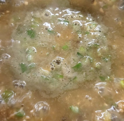 - 멸치육수에 보리쌀가루와 된장을 풀어 끓인다 (끓을때까지 눌지않게 저어준다)