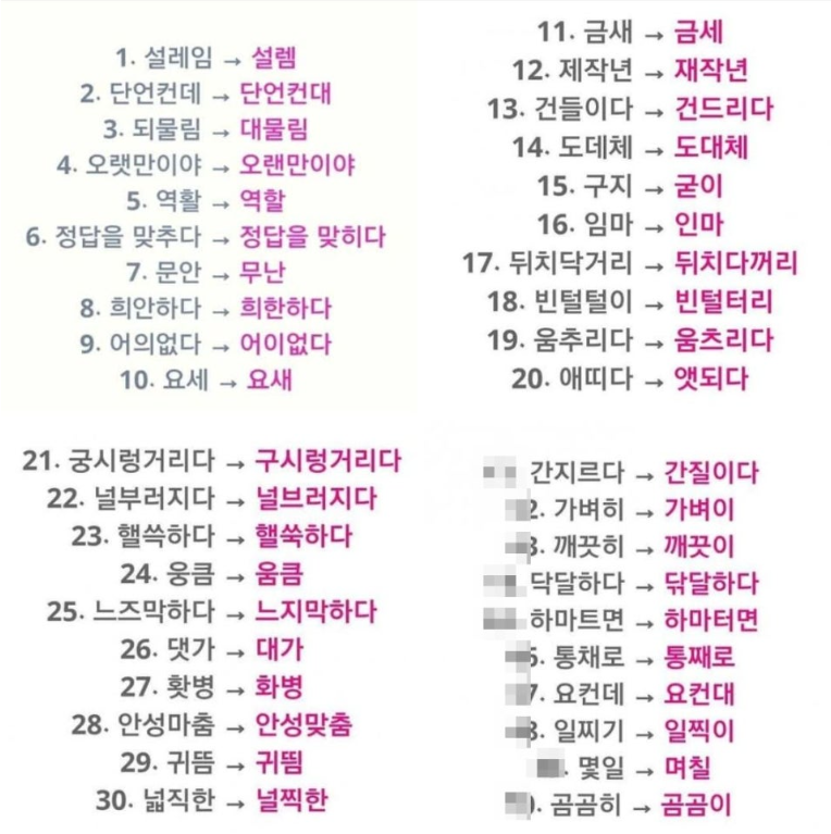 많이 틀리는 단어 맞춤법을 보니 쉽다고 생각하나, 또 나름 잘 틀리는 단어위주입니다. 메모 잘했다가 틀리지 않도록 ` 특히 업무에서 맞춤법이 틀리면 성의 없어 보이는 경우가 있어 유의 해야 겠습니다