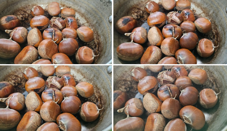 칼집 자국을 낸 밤이 물에 반 정도 잠기게 하여 은근히 익혀주면 물이 사라지고 바닥에 약간 타듯이