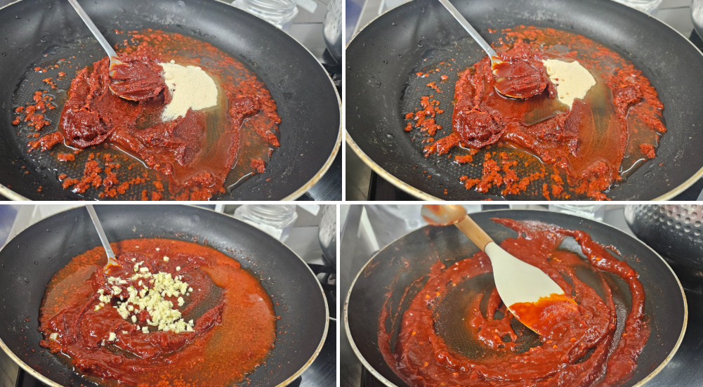 정종1큰술, 다진마늘1작은술, 육수 또는 물 2큰술을 넣고 먼저 끓입니다. 고추장에는 발효가 일어나 비타민이 사라졌는데 고추가루를 넣어 비타민을 보충합니다
