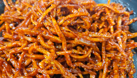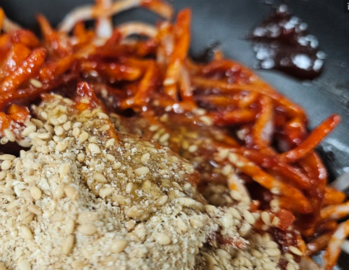 일미무침에 부드러운 올리고당을 넣어 농도와 맛과 색깔을 조정합니다