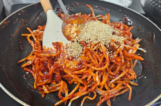 - 양념장에 깨소금, 참기름, 오징처채를 넣고 무친다