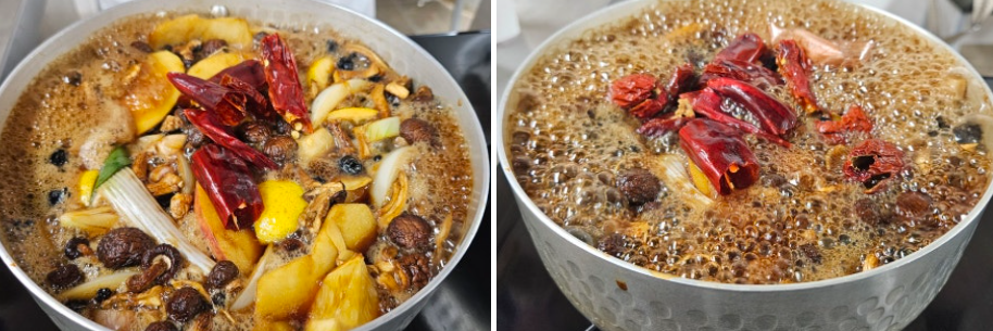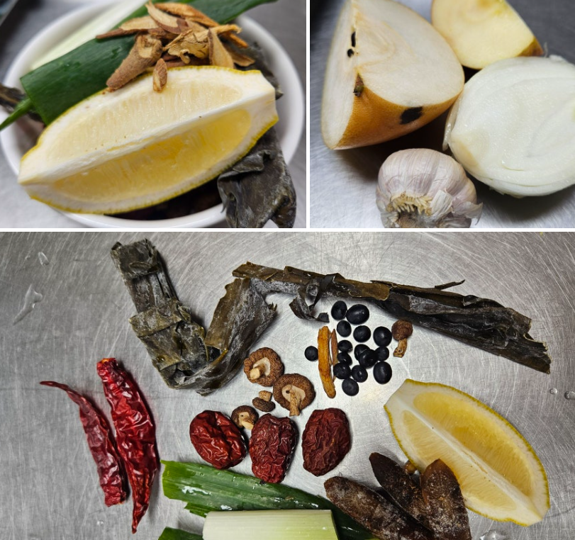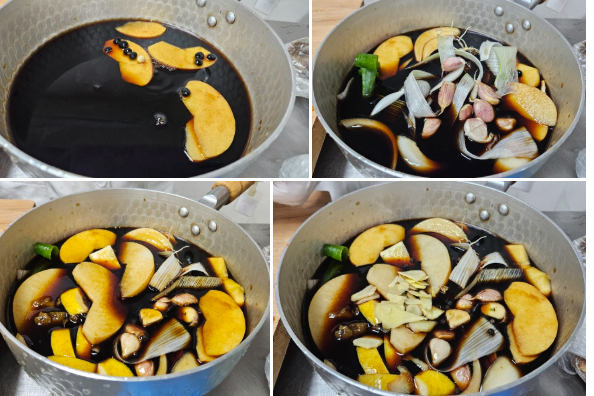 2. 양념간장 : 간장2컵, 물2컵, 소금1큰술, 다시마1개,사과1/4개, 레몬1조각,검정콩20g, 감초2조각, 설탕 2큰술, 마늘, 생강, 대파, 양파, 우엉, 통후추, 마른고추, 정종, 매실청