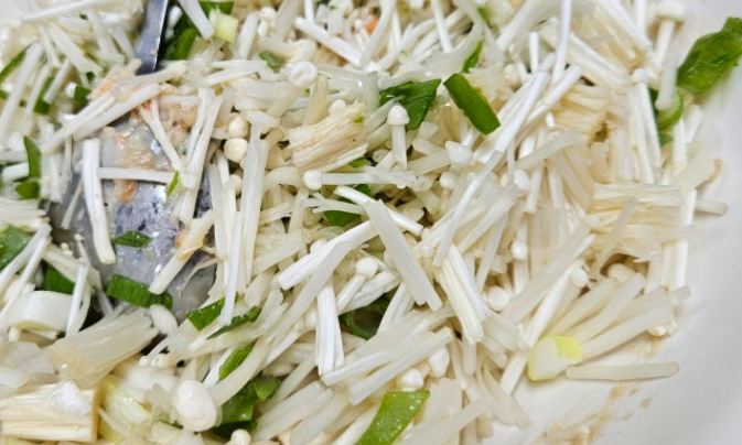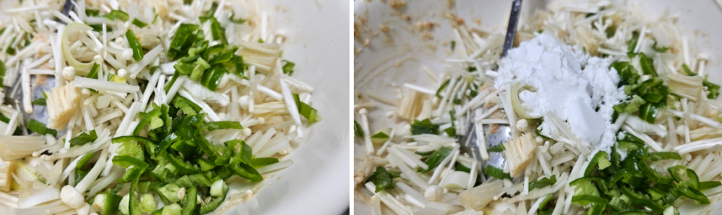 팽이 버섯 계란 전 준비된 재료를 적당한 크기로 잘라 다 섞어 반죽하면 기본적 준비가 끝납니다