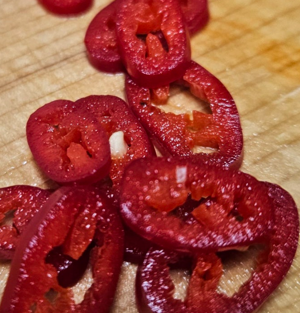 5. 고명용 빨간고추도 씨를제거가고 동그랗게 잘라줍니다6
